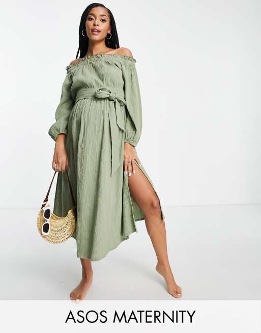 ASOS DESIGN Maternity off shoulder super crinkle beach maxi dress in khaki