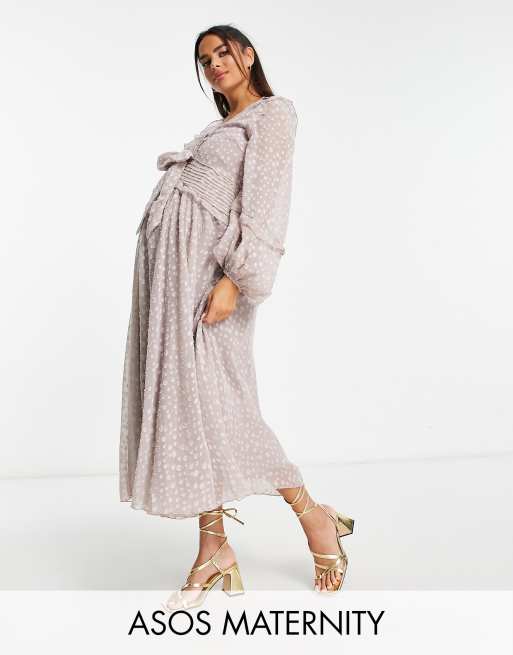 ASOS DESIGN Maternity pleat detail midi dress in jacquard satin spot with tie detail in lilac