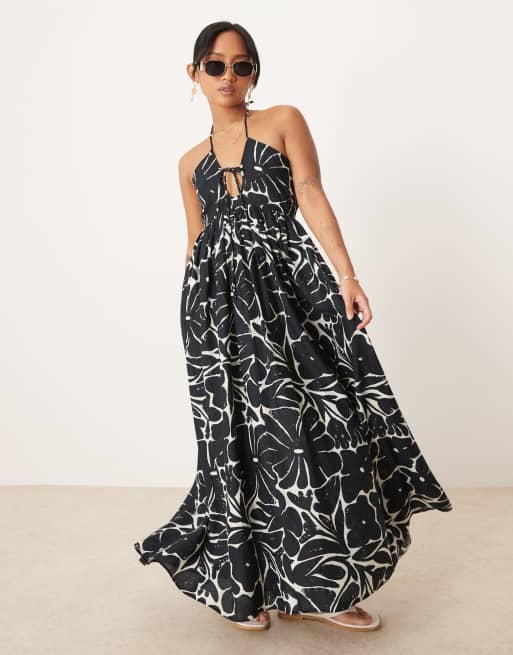 ASOS DESIGN Petite bandeau lace up maxi beach dress with linen in mono floral