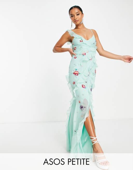 ASOS DESIGN Petite bias cut maxi dress with ruffle detail and floral embellishment
