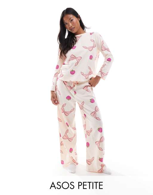 ASOS DESIGN Petite bow and fruit long sleeve top & trouser pyjama set in pink