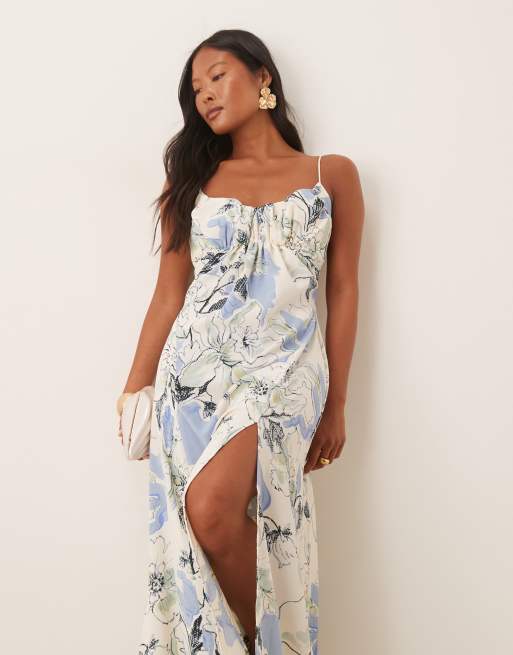 ASOS DESIGN Petite gathered bust strappy cross back midi dress in blue floral print