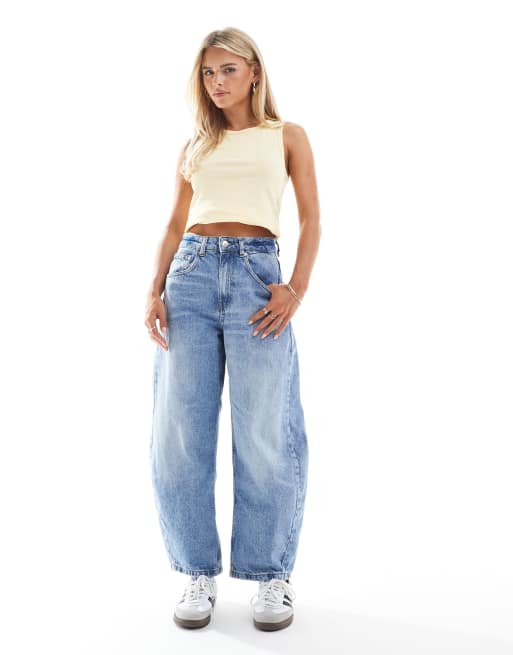 ASOS DESIGN Petite high waisted barrel leg jeans in mid blue