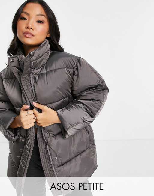 ASOS DESIGN Petite luxe shiny oversized puffer jacket in charcoal