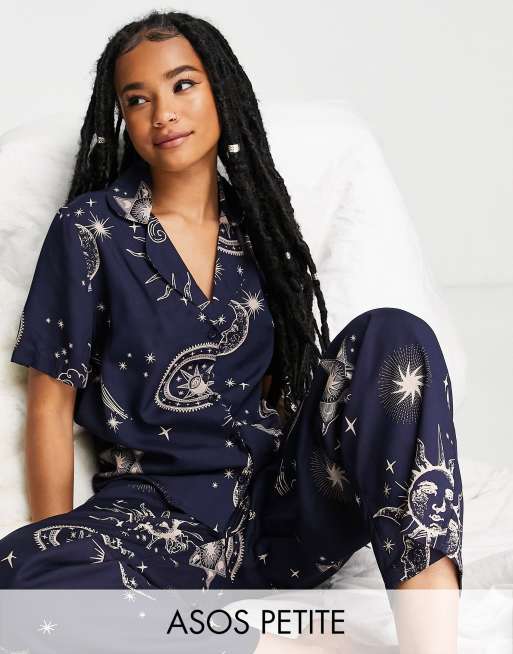 ASOS DESIGN Petite modal horoscope shirt & trouser pyjama set in navy
