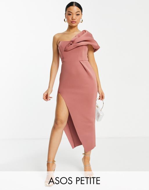 ASOS DESIGN Petite one shoulder seamed bust midi dress with high leg split in rose