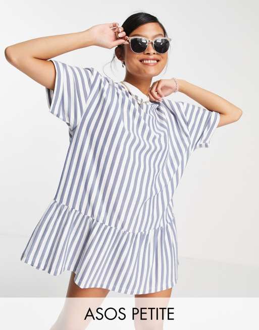 ASOS DESIGN Petite oversized t-shirt dress with frill hem in blue and cream stripe