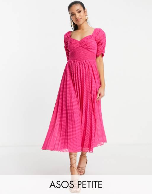 ASOS DESIGN Petite ruched front pleated midi dress with shirred waist in chevron dobby in hot pink