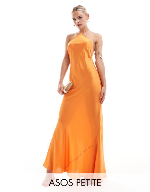 ASOS DESIGN Petite satin halter maxi dress with shaped back detail in orange