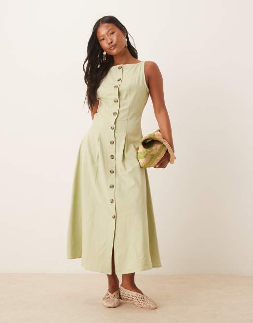 ASOS DESIGN Petite slash neck button down waistcoat midi dress sage
