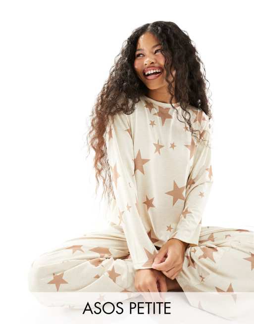 ASOS DESIGN Petite super soft star long sleeve top & trouser pyjama set in cream