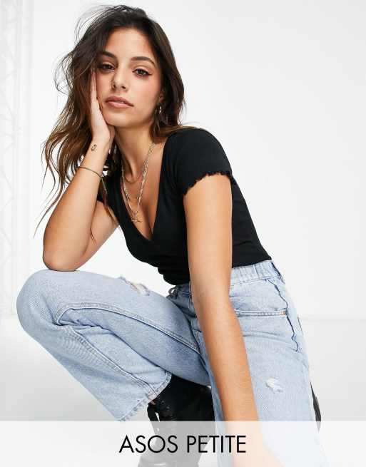 ASOS DESIGN Petite v neck bodysuit with lettuce edge in black