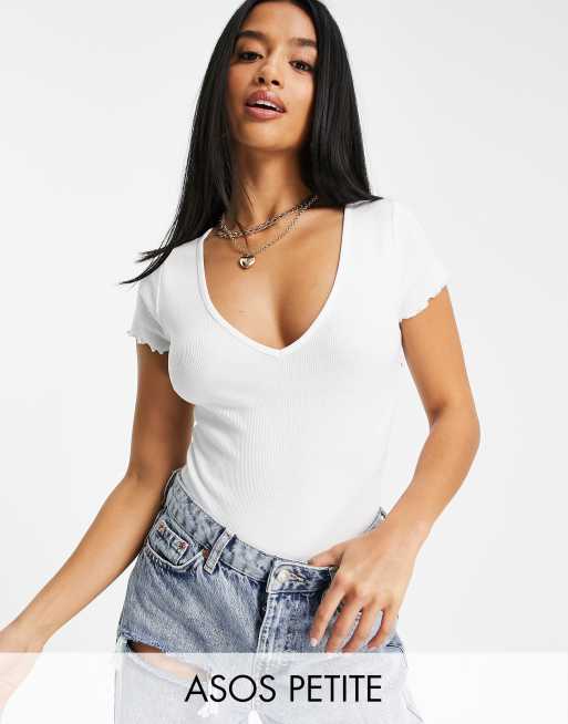 ASOS DESIGN Petite v neck bodysuit with lettuce edge in white