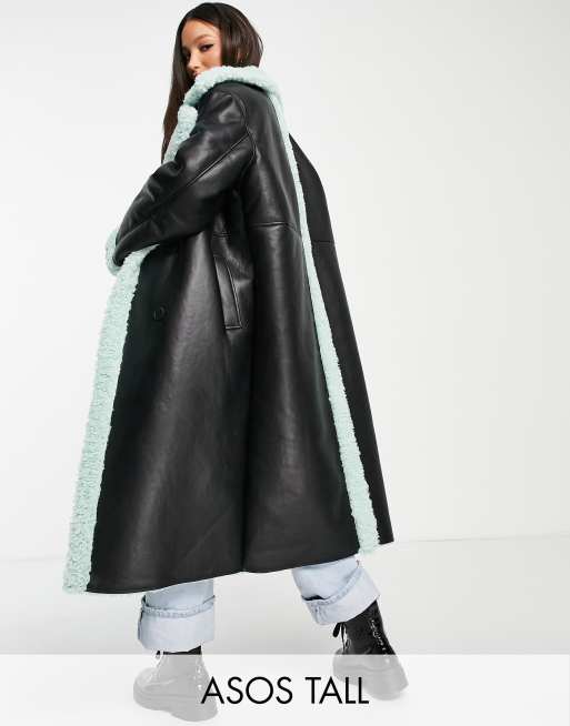 ASOS DESIGN Tall bonded borg trench coat in black and mint