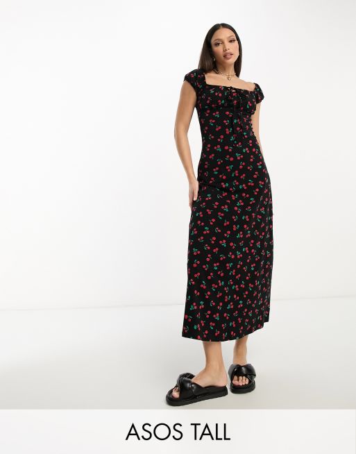 ASOS DESIGN Tall cap sleeve ruched midi tea dress in black cherry print