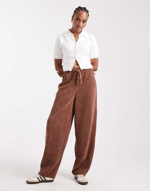 ASOS DESIGN Tall cord barrel leg pull on trousers in chocolate