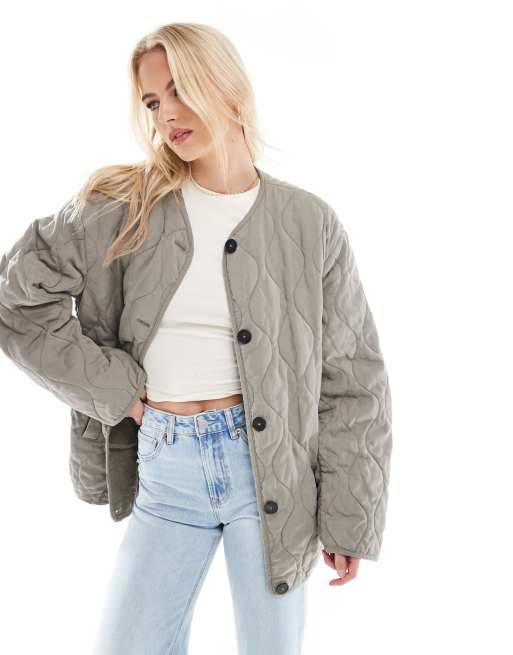ASOS DESIGN Tall dolphin hem collarless quilted jacket in khaki