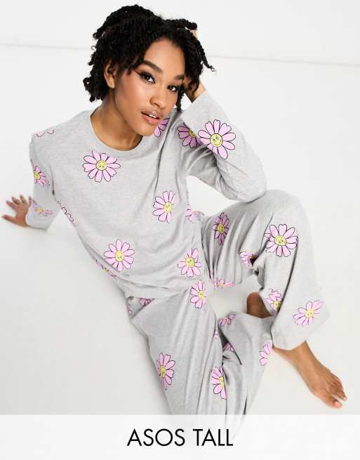 ASOS DESIGN Tall exclusive flower long sleeve top & trouser pyjama set in grey marl