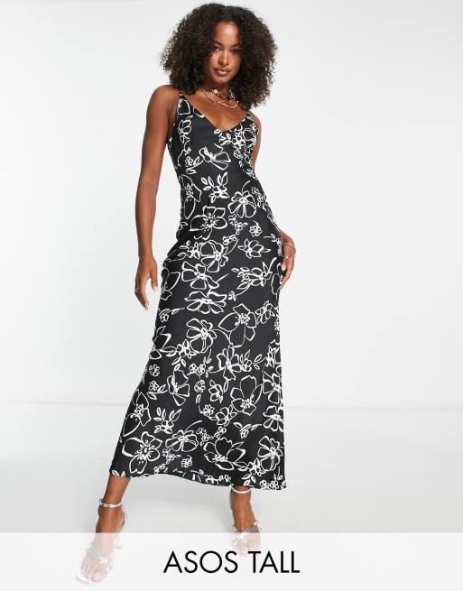 ASOS DESIGN Tall high apex satin maxi slip dress in black based white floral