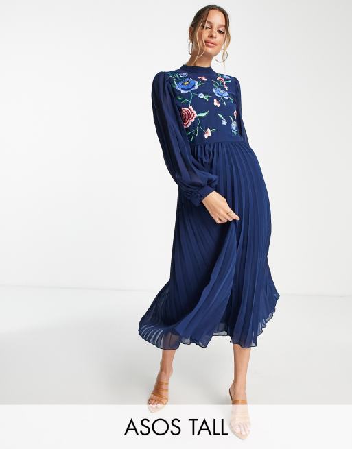 ASOS DESIGN Tall high neck pleated long sleeve skater midi dress with embroidery in navy