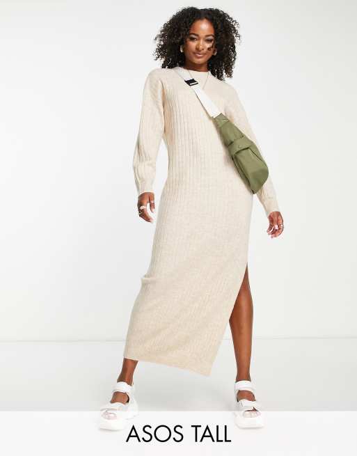 ASOS DESIGN Tall knitted maxi dress with side split in wide rib in oatmeal