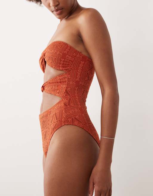 ASOS DESIGN Tall Kyle broderie Brooke twist front bandeau swimsuit in rust