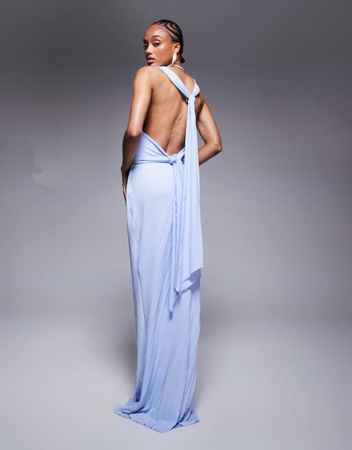 ASOS DESIGN Tall pleated slash neck maxi dress with knotted back detail in light blue