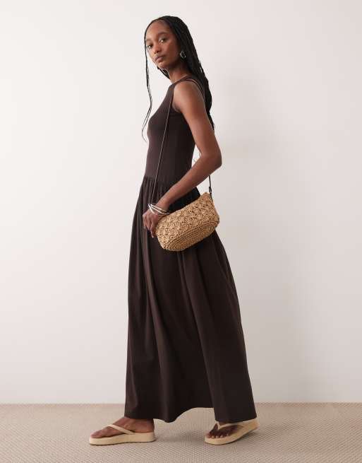 ASOS DESIGN Tall rib mix midi dress with drop waist in chocolate