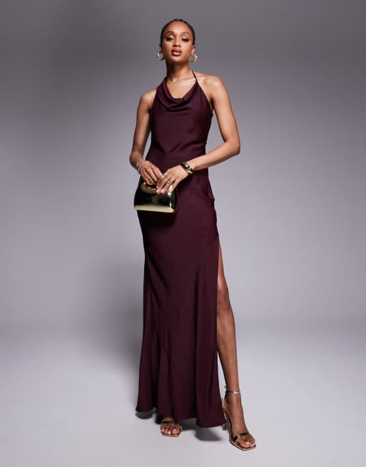 ASOS DESIGN Tall satin asymmetric strap midaxi dress with split in dark cherry