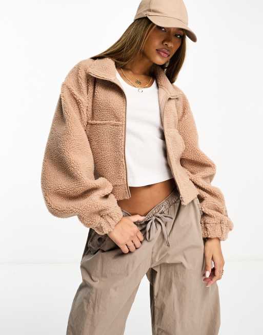 ASOS DESIGN Weekend Collective cropped borg zip through in camel with woven label