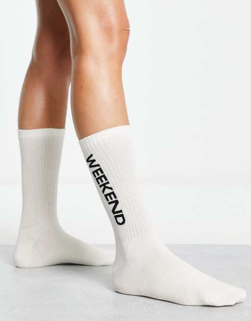 ASOS Weekend Collective calf length rib socks with horizontal split logo in white