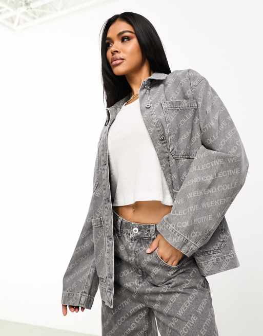 ASOS Weekend Collective co-ord oversized laser print denim jacket in washed grey