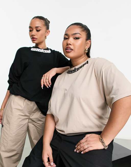 ASOS Weekend Collective Curve oversized t-shirt with collar logo in neutral