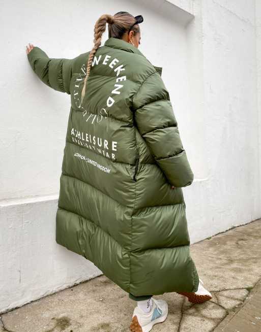 ASOS Weekend Collective maxi padded coat with back graphic in khaki