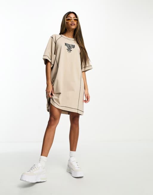 ASOS Weekend Collective oversized sweat dress with contrast stitching in neutral