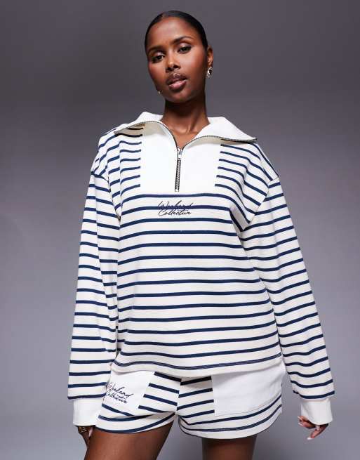 Weekend Collective long sleeve half zip sweatshirt in navy stripe with scribble graphic embroidery