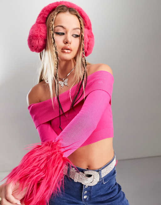 ASYOU fur cuff bardot knitted crop top in hot pink