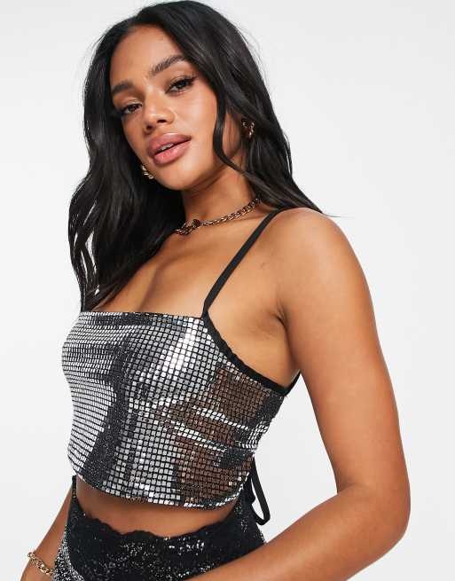 ASYOU square sequin tie back cami top co-ord in silver