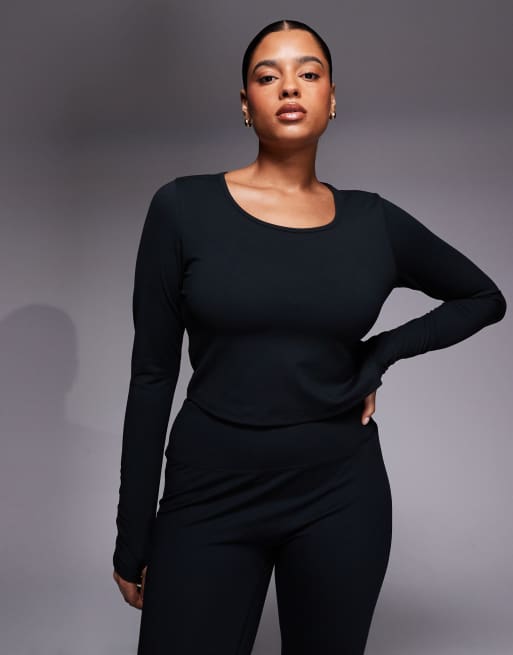 4505 soft touch scoop neck long sleeve top with ruched sleeves in black
