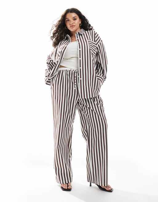 4th & Reckless Plus cotton wide leg boxer detail tie waist pants in brown stripe (part of a set)