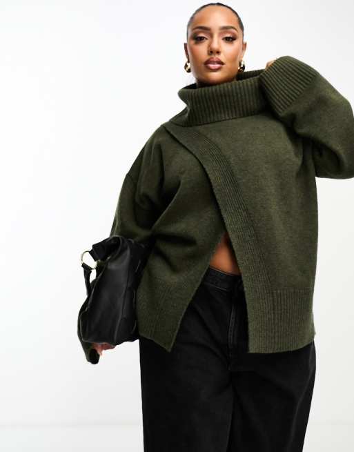 4th & Reckless Plus front split roll neck jumper in khaki