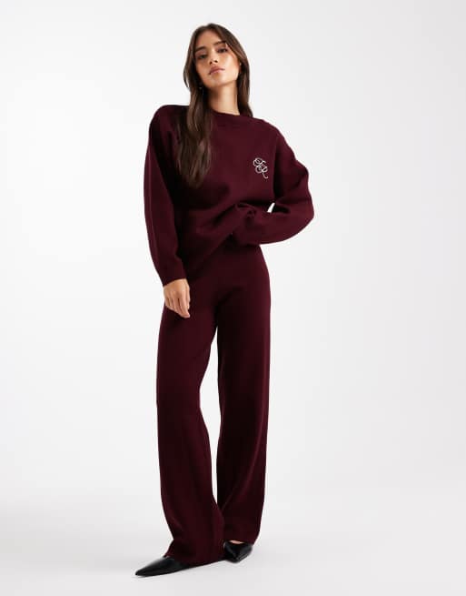 4th & Reckless knitted embroidered logo detail jumper and wide leg pants set in burgundy