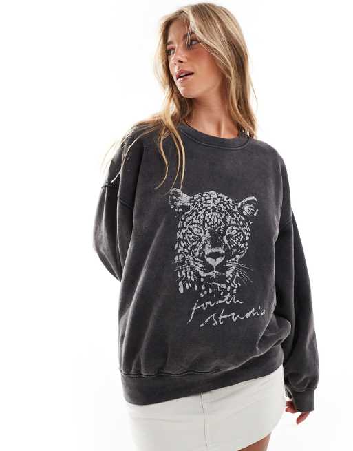 4th & Reckless leopard motif sweatshirt in black acid wash