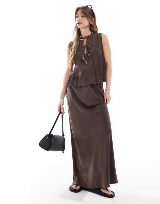 4th & Reckless linen look pleat tie front top & drawstring waist maxi skirt set in chocolate