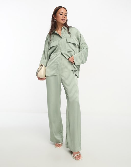 4th & Reckless satin shirt and wide leg pants set in sage green stripe