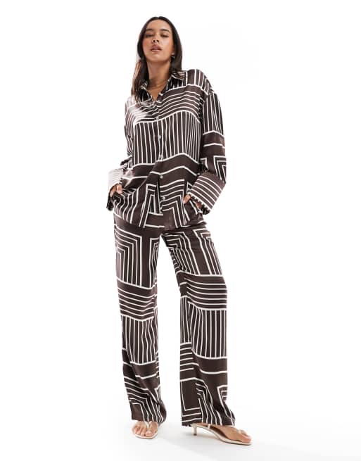 4th & Reckless satin wide cuff button front shirt and satin wide leg pants set in brown tile print