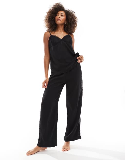 4th & Reckless satin wide leg lace panel detail pyjama pants in black (part of a set)