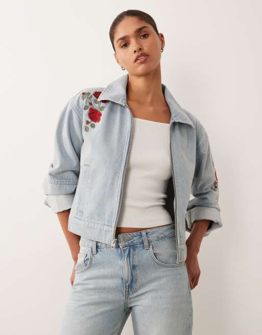 Abercrombie & Fitch denim jacket with floral embroidery in light wash blue
