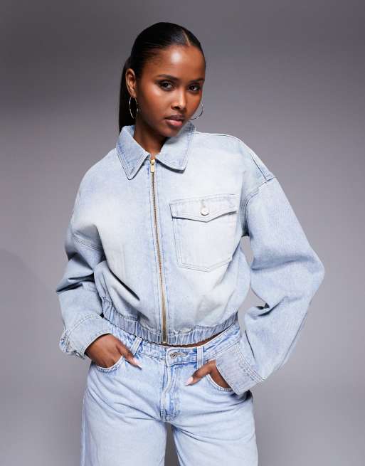 Abrand cropped denim bomber jacket with chest pocket in light wash blue