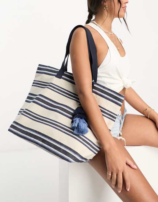 Accessorize horizontal stripe tote bag with tassels in cream and navy